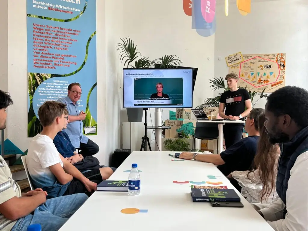 Co-Creation-Phase mit Unternehmen (TÜV Rheinland, Thyssenkrupp Nucera), EU & Landesregierung NRW (u. a. Mona Neubaur) und Pilotschulen.